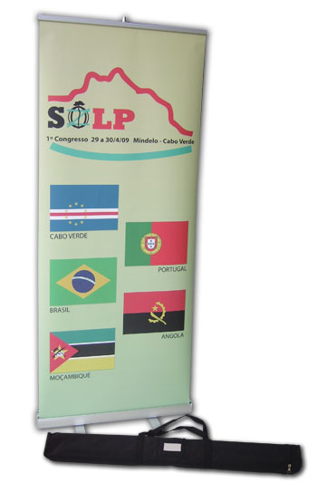 Roll up para eventos com estrutura em alumínio e bolsa para transporte incluído. Nas as medidas de 80 cm de largura por 2,20 m.